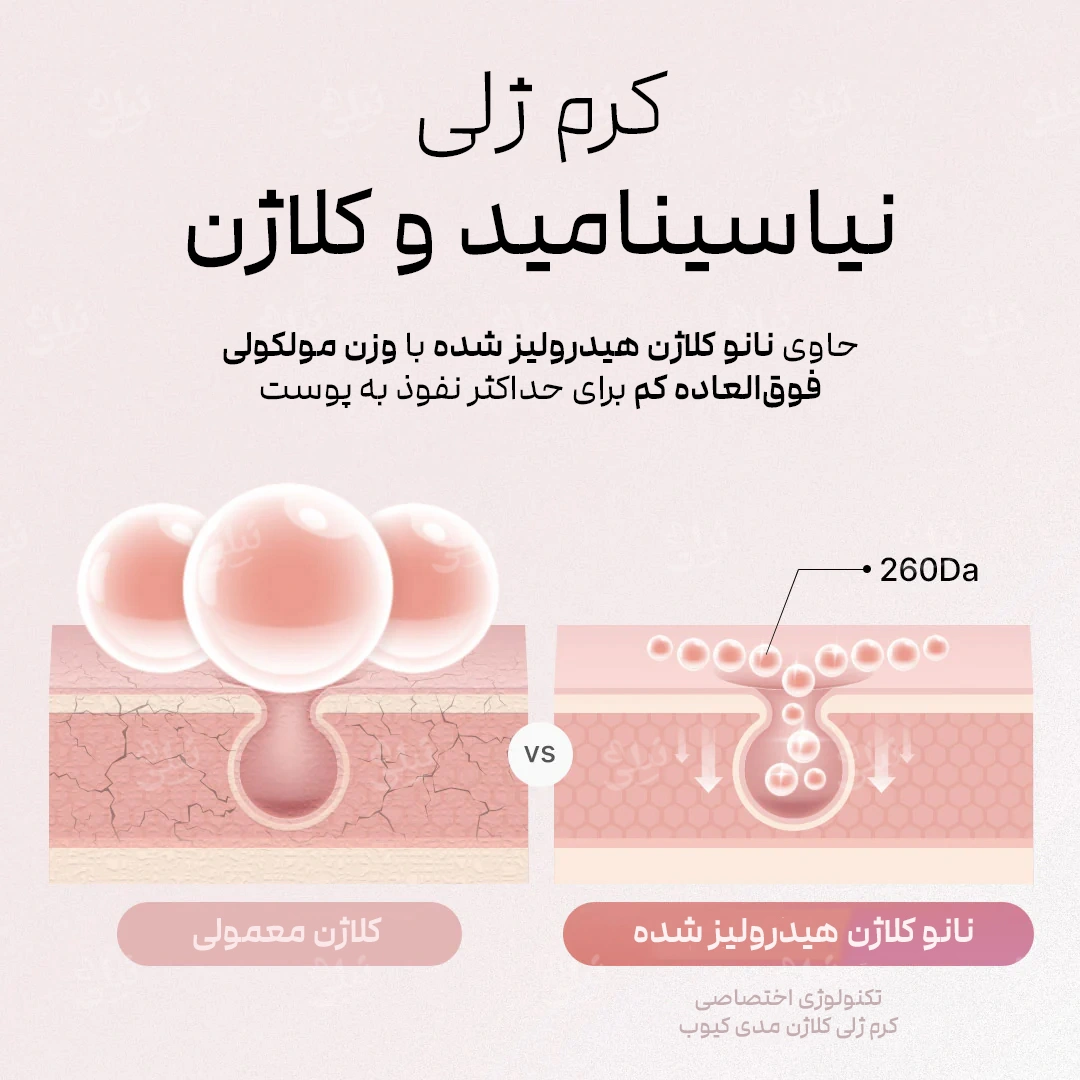 کلاژن هیدرولیز شده با جذب بالا: حاوی کلاژن با وزن مولکولی بسیار پایین است که برخلاف کرمهای کلاژن معمولی، به راحتی در لایههای عمیق پوست نفوذ کرده و ساختار پوست را از درون بازسازی میکند.